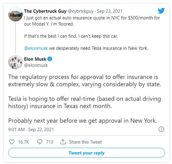 馬斯克在昨晚的推特上說:“批準(zhǔn)提供保險的監(jiān)管過程極其緩慢和復(fù)雜,各州的情況大不相同。”馬斯克給出了最新的細節(jié),即客戶可以期待特斯拉保險在得克薩斯州和紐約州推出的時間。馬斯克說,得克薩斯州可能最快在下個月推出特斯拉保險,客戶的費率將基于實際駕駛記錄。此外,如果一切按計劃進行,可能會在2022年在紐約推出保險項目。該項目計劃走向國際,但不是在短期內(nèi)。