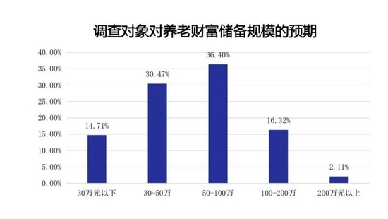 但就養(yǎng)老財(cái)富儲(chǔ)備規(guī)模預(yù)期而言,超過(guò)八成的調(diào)查對(duì)象認(rèn)為整個(gè)養(yǎng)老期間的財(cái)富儲(chǔ)備規(guī)模在100萬(wàn)以內(nèi)即可滿足養(yǎng)老需求;不到20%的認(rèn)為養(yǎng)老財(cái)富儲(chǔ)備需要達(dá)到100萬(wàn)以上。