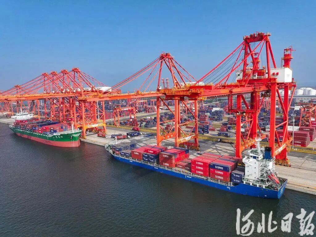 7月9日,河北港口集團(tuán)唐山港京唐港區(qū)集裝箱碼頭,新一代穿越式雙小車自動(dòng)化岸橋正在進(jìn)行作業(yè)。 趙杰攝
