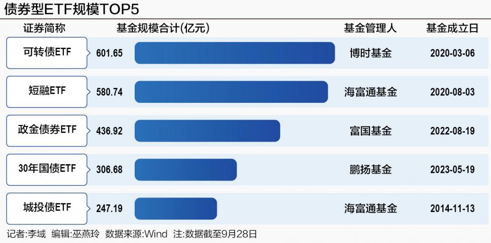 Wind數(shù)據(jù)顯示,截至9月28日,32只債券型ETF規(guī)模突破百億元大關,其中,博時可轉(zhuǎn)債ETF規(guī)模突破600億元,海富通短融ETF規(guī)模580億元,規(guī)模位居前列。