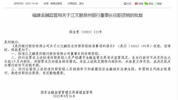 近日,福建金融監(jiān)管局發(fā)布相關(guān)批復(fù)顯示,核準(zhǔn)江文鵬泉州銀行股份有限公司董事長(zhǎng)的任職資格。