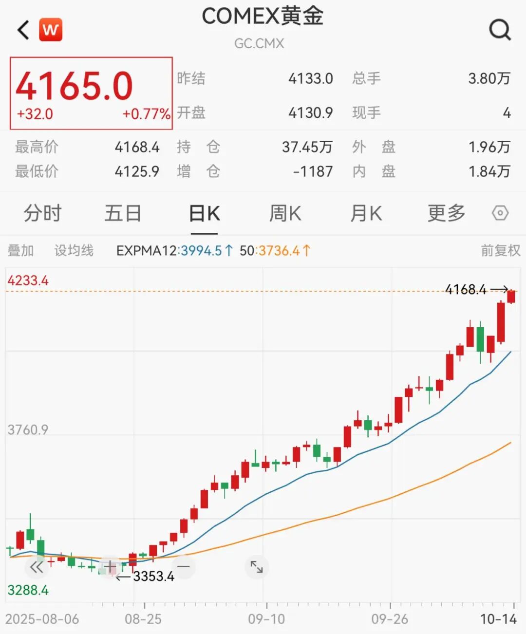 10月14日盤(pán)中,國(guó)際金價(jià)持續(xù)拉升,截至發(fā)稿,倫敦現(xiàn)貨黃金價(jià)格站上4140美元/盎司,COMEX黃金期貨價(jià)格站上4160美元/盎司,續(xù)刷歷史新高。