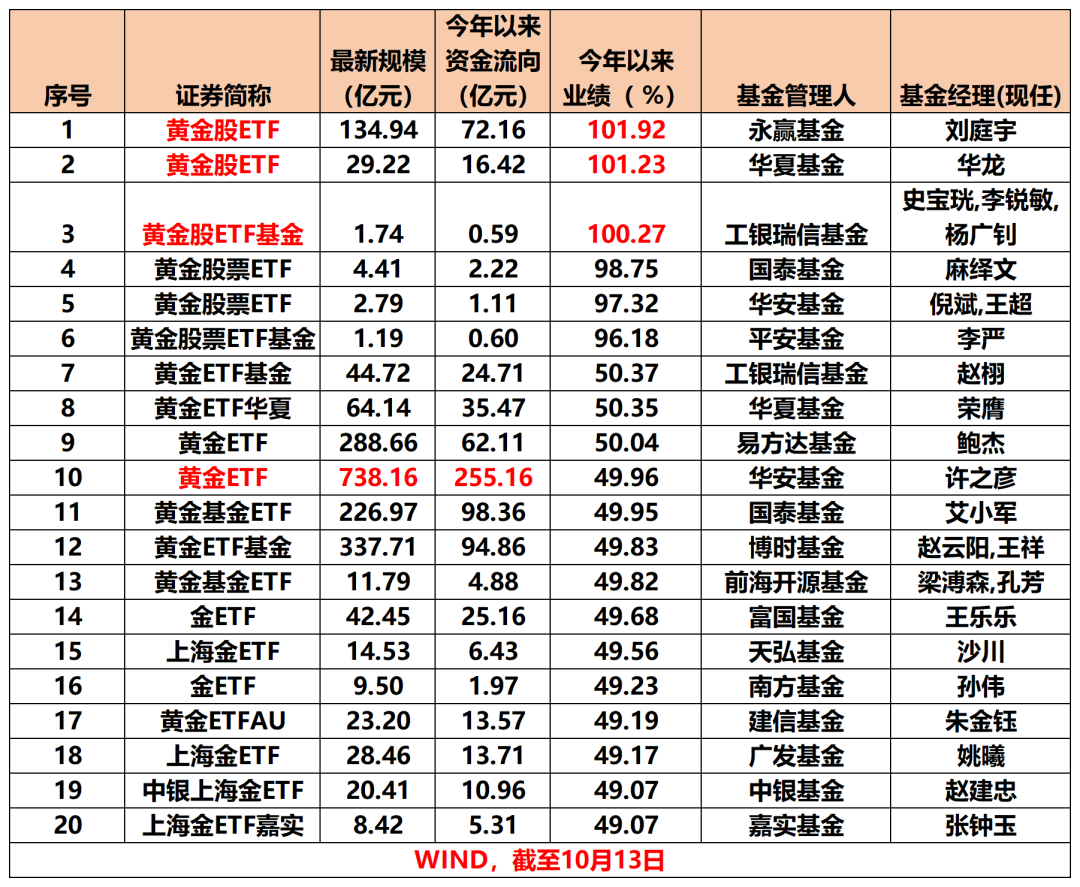業(yè)績(jī)方面,截至10月13日,黃金主題ETF年內(nèi)單位凈值增長(zhǎng)率均為正,平均值為64.55%。