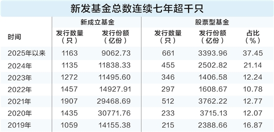 截至2025年10月19日,今年以來新成立基金總數(shù)達(dá)1163只,已超越2024年全年的1135只。盡管2025年尚未結(jié)束,但新成立基金數(shù)量已實(shí)現(xiàn)超越,顯示出基金市場(chǎng)的強(qiáng)勁復(fù)蘇態(tài)勢(shì)。其中,股票型基金呈現(xiàn)爆發(fā)式增長,新成立數(shù)量達(dá)到661只,發(fā)行規(guī)模達(dá)到3393.96億元,占總發(fā)行規(guī)模的37.45%,這一比例創(chuàng)下2011年以來的近15年新高。