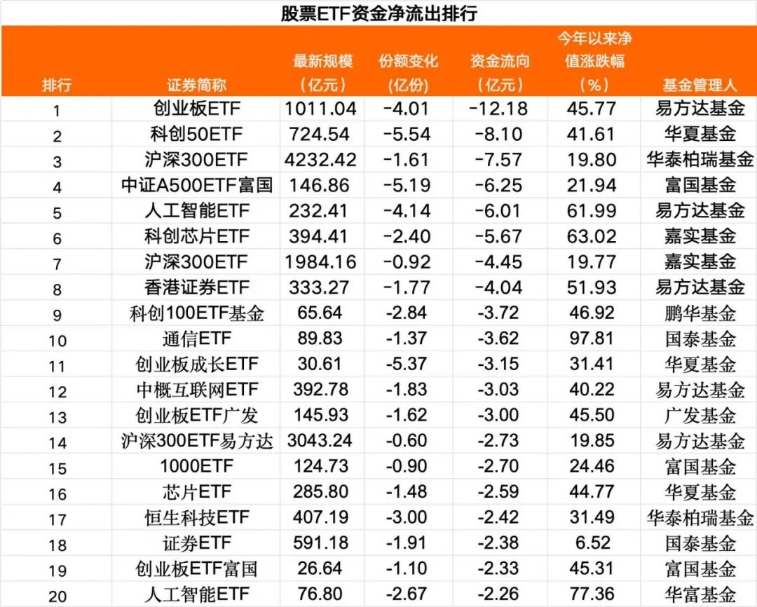 在資金凈流出前20大股票ETF中,4只創(chuàng)業(yè)板ETF合計(jì)凈流出資金超20億元,3只滬深300ETF合計(jì)凈流出接近15億元,2只科創(chuàng)相關(guān)ETF資金合計(jì)凈流出近12億元。此外,人工智能、芯片、券商等相關(guān)ETF資金凈流出也較多。