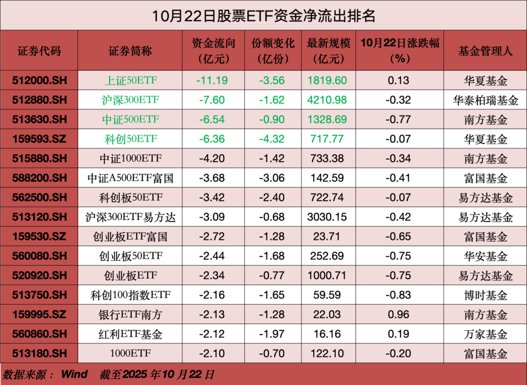 10月22日(本周三),A股三大指數(shù)全線收跌,截至收盤,滬指跌0.07%,深成指跌0.62%,創(chuàng)業(yè)板指跌0.79%。在市場震蕩調(diào)整之時,股票ETF部分資金“跑了”。