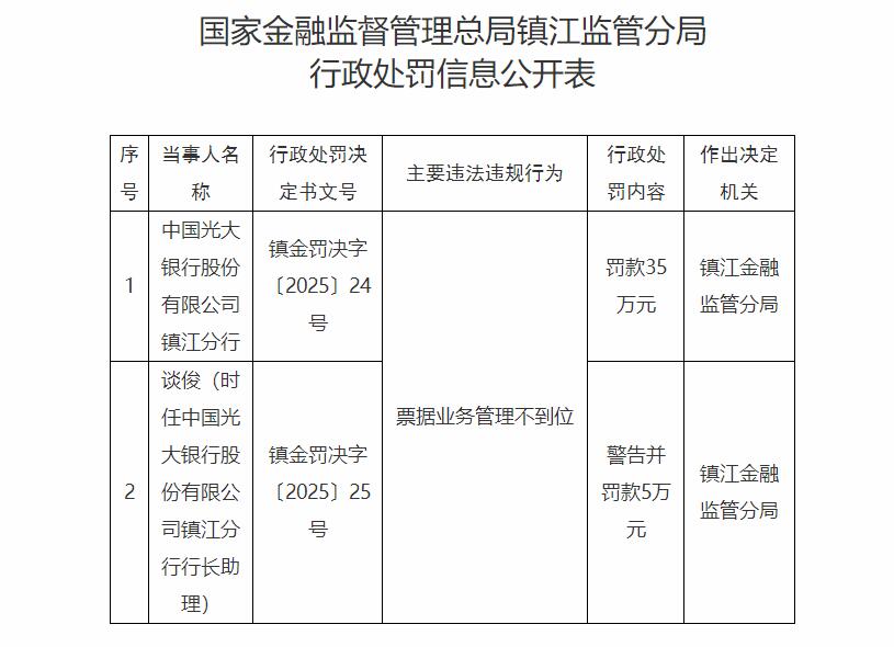 國家金融監(jiān)督管理總局鎮(zhèn)江監(jiān)管分局近日公布的行政處罰信息公開表(鎮(zhèn)金罰決字〔2025〕24號、25號)顯示,中國光大銀行股份有限公司鎮(zhèn)江分行票據(jù)業(yè)務(wù)管理不到位,被罰款35萬元。談?。〞r任中國光大銀行股份有限公司鎮(zhèn)江分行行長助理)被警告并罰款5萬元。